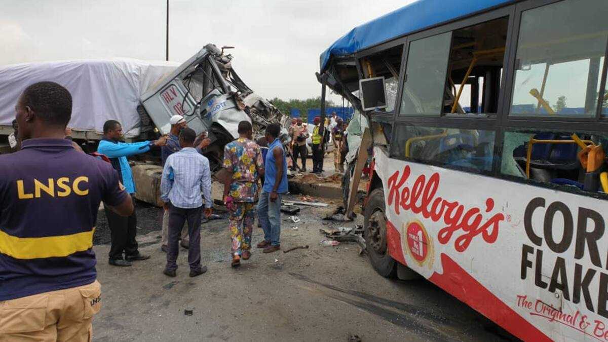 A jawabin suka ce: "Muna isa wajen, wata motar Dangote dauke da Siminti ta samu matsalar birki kawai tayi kicibis da doguwar motar hayar Primero mai lamba LSR-228XS dauke da fasinjoji 40 a zaune, 20 a tsaye."